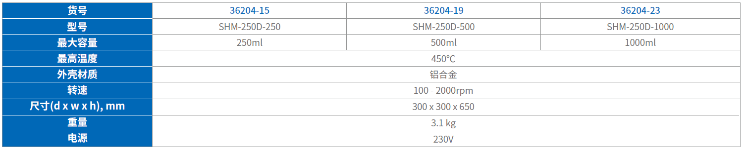 SHM-250 数显磁力加热套可通过*的电子控制将容量为100至250mL、500mL或1000mL的圆底烧瓶搅拌并加热至450°C的元件温度,从而*测量温度和搅拌。模块化设计允许使用相同的SHM-250数字控制器作为底座互换不同尺寸的加热盒,是适合用户的非常经济*的选择。